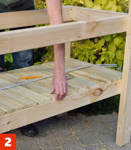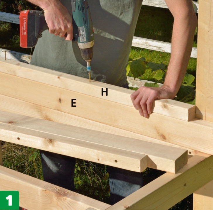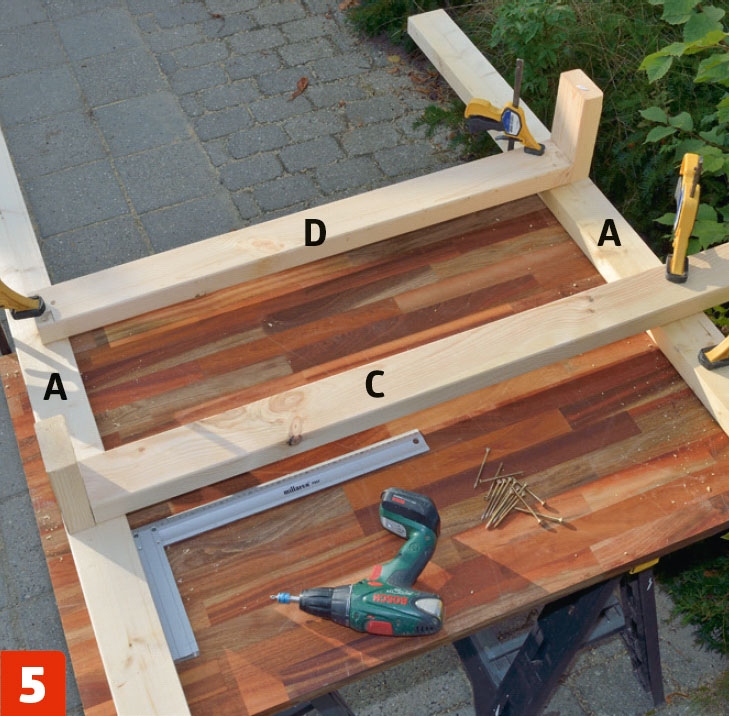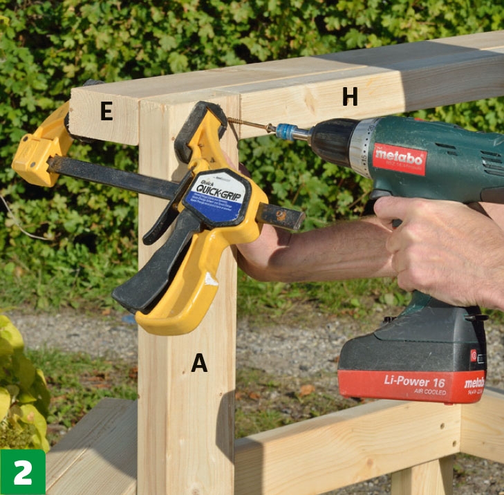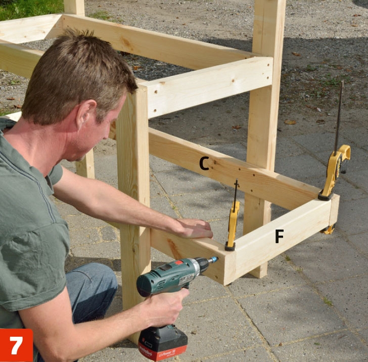Legg ut delene til baksiden, og sett dem sammen på samme måte med 5 x 80 mm skruer og støtteklosser, slik at det også her blir plass til tverrstivere (G).