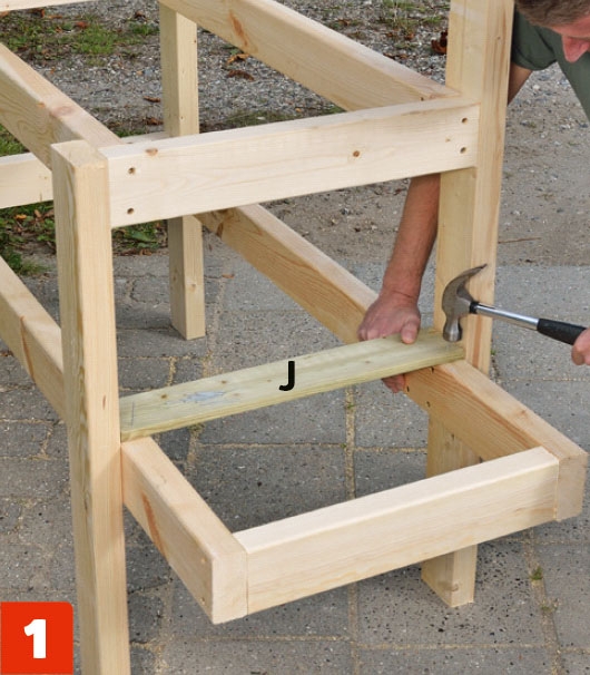 Vi begynner underhyllen med å spikre på det fremste og det bakerste bordet (J) med 1,8 x 40 mm dykkert.