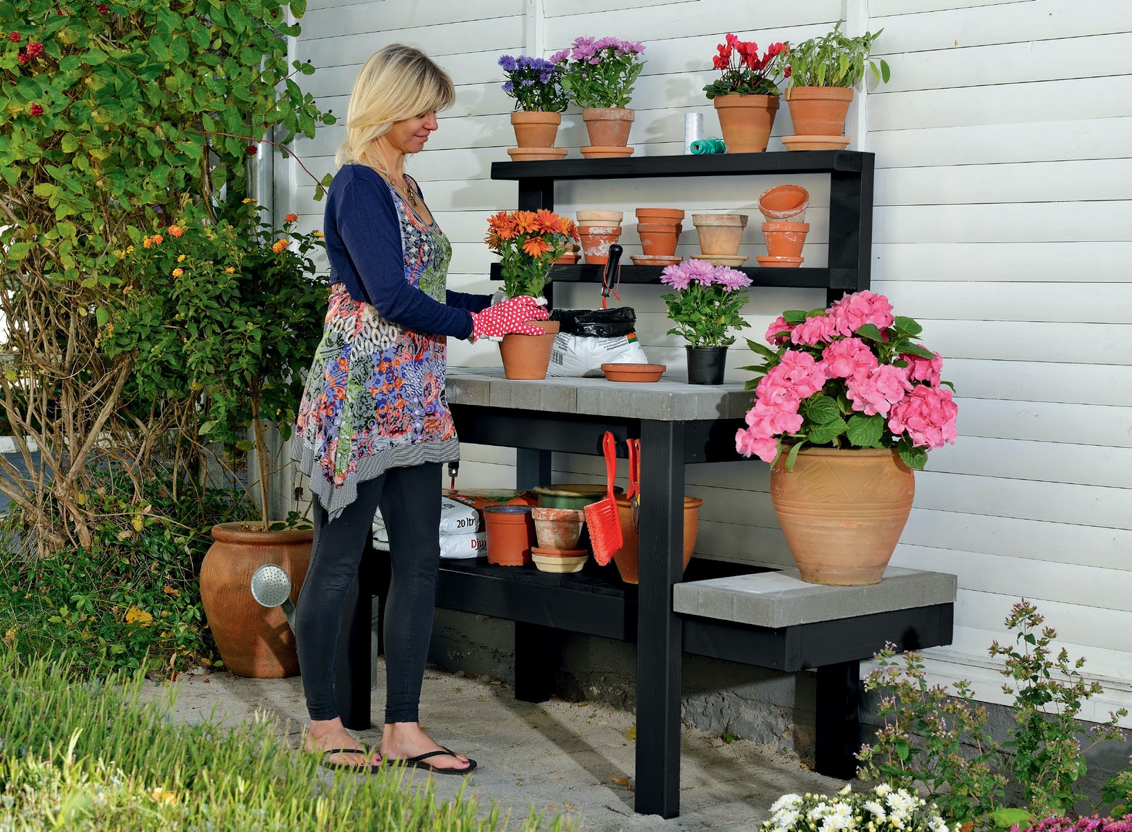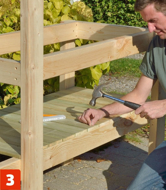 Til slutt settes de øverste hyllene sammen, og skrus fast til under stellet. Nå kan du velge om du vil gi bordet trebeskyttelse, eller legge på betonghellene og begynne å bruke bordet med en gang.