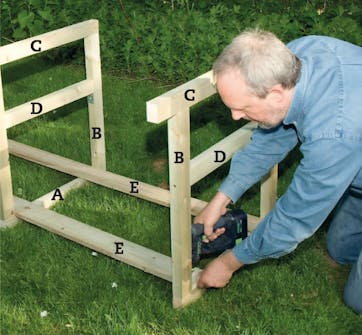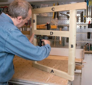 Sag ut delene, og sett sammen A, B, C og D til rammer med 100 mm skruer. Det blir pent å undersenke skruene.