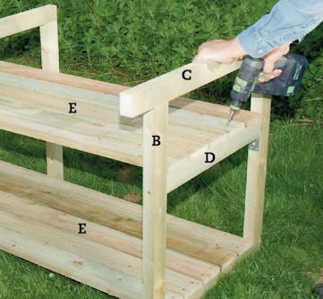 Skru fast bordene (E) på D til den øverste hyllen. Rett til rammen først, slik at den er i vinkel både loddrett og vannrett. Det er en god idé å forbore i enden av bordene, så treet ikke sprekker.