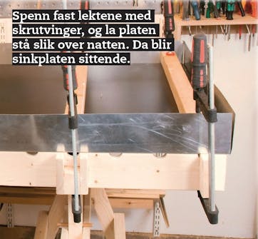 Spenn fast kryssfinérplaten i bunnen av sinkplaten. Legg et par lekter på tvers, jevnt fordelt over hele platen. Sidene på sinkplaten bøyes opp ved å slå med en trekloss og hammer mens plate og sink er spent godt sammen.