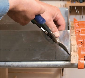 Klipp hjørnene av sinkplaten, slik at du kan bøye sinkplaten rundt forskalingsplaten. Du kan fint klippe i platen med en platesaks.