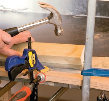 Bøy sidene på sinkplaten med en trekloss og en hammer. Når du bruker en trekloss, blir det ikke merker i sinken. Bøyen på platen limes og holdes med en planke, som spennes fast med tvinger.