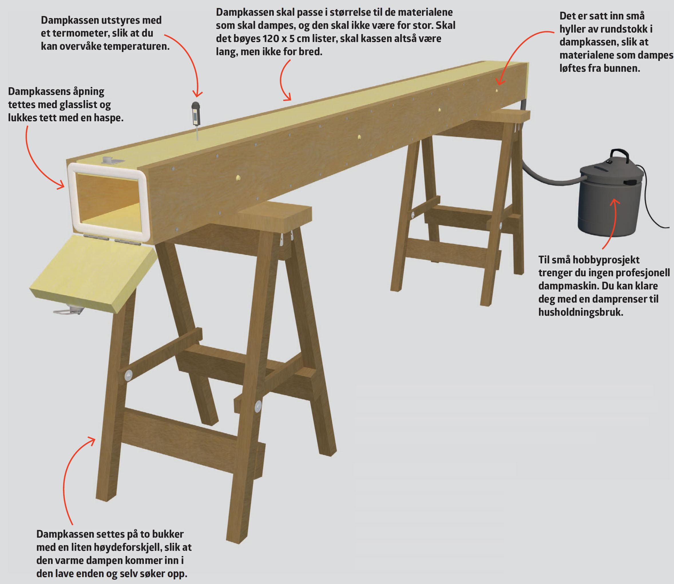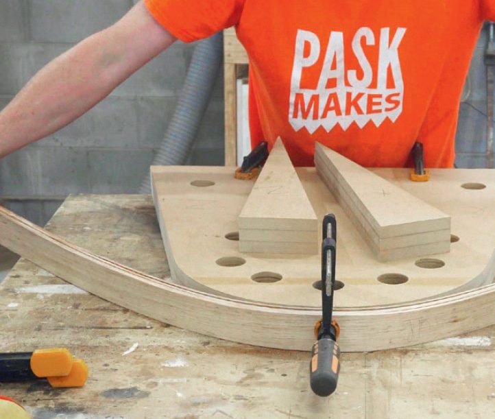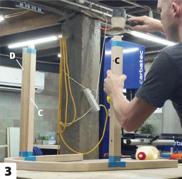 Damp ni lister (A) i minimum 30 minutter, og bøy dem straks rundt formen. Listene bøyes sammen og settes i spenn med 8-12 tvinger, som settes i hullene på kanten. Treet er varmt, så husk hansker.