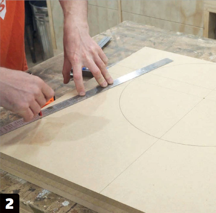 Lim sammen de tre MDF-platene (F). Tegn en strek som deler platene på langs. Tegn enda en strek som deler platene på tvers 20 cm fra toppen. Tegn en sirkel med en radius på 20 cm med senter i krysset.