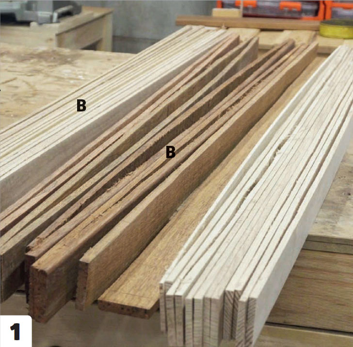 - 18 lister à 173 x 4,8 x 0,3 cm (A). Du kan eventuelt bruke 1/3 mørkt tre som kontrast.