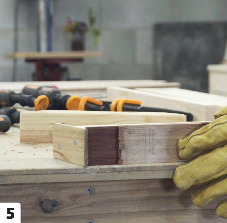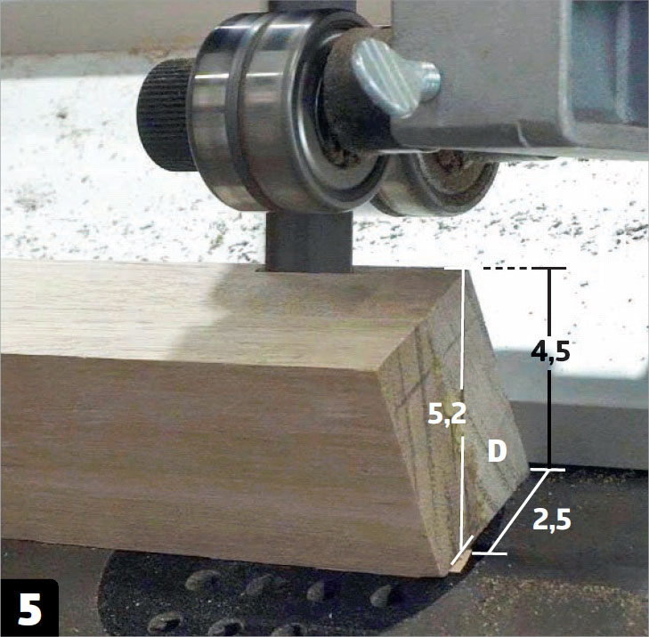Monter listen som er skåret i vinkel (D) oppå en tverrgående list (C). Bruk lim. Bruk også et par skjulte plugger. Det skal være plass til en avstandslist på den skrå overflaten. Denne limes ikke fast ennå.