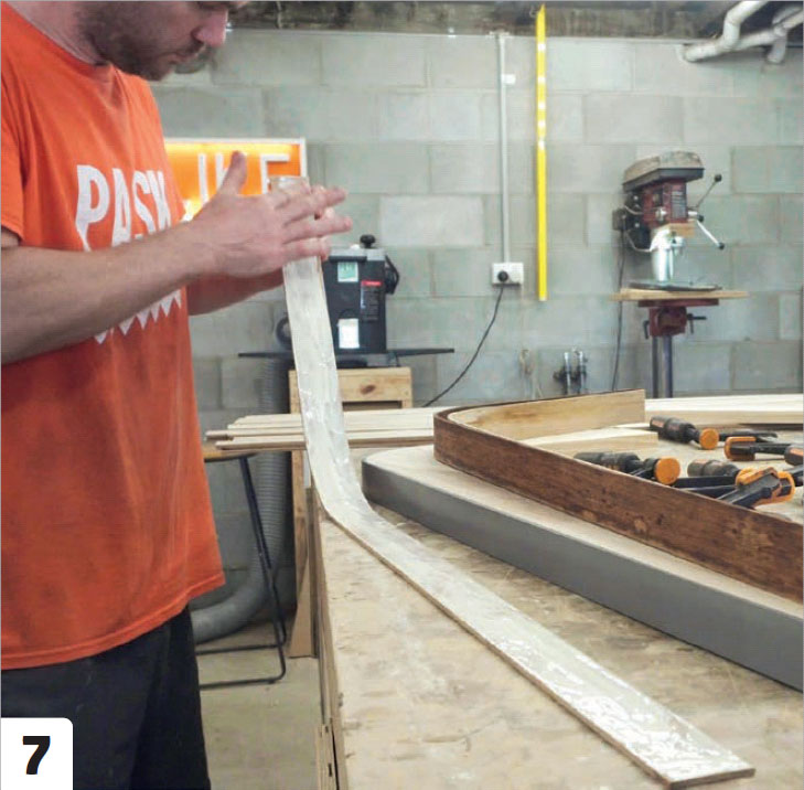 Vent et halvt døgn mens treet tørker. Fjern tvingene. Du vil oppleve at treet trekker seg litt unna formen. Nå skal listene limes sammen og deretter tilbake på formen mens limet tørker. Bruk trelim.