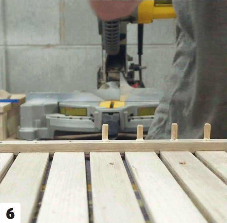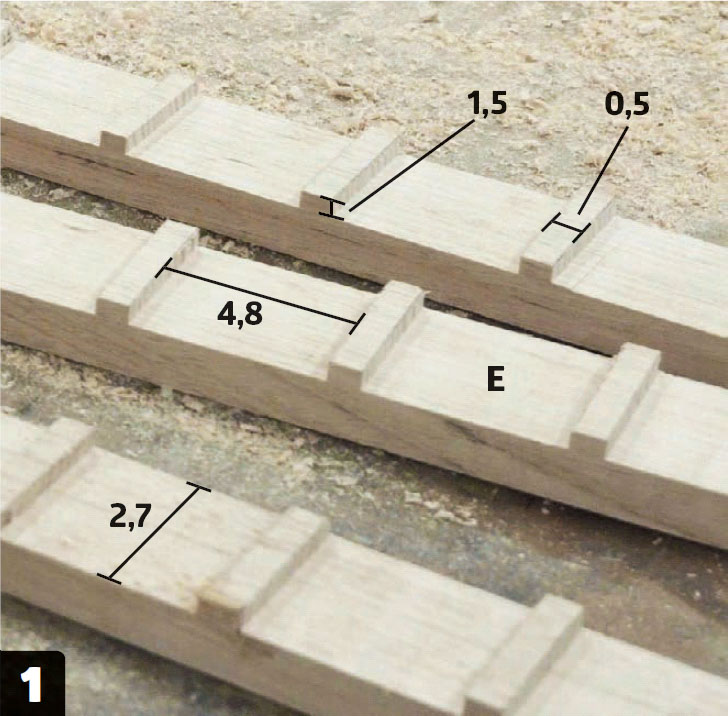Legg en avstandslist (E) mellom beina. Den skal ligge oppå den tverrgående listen (C). Klargjør sammenføyningen med et par skjulte plugger mellom listene. Pluggene limes ikke fast ennå.
