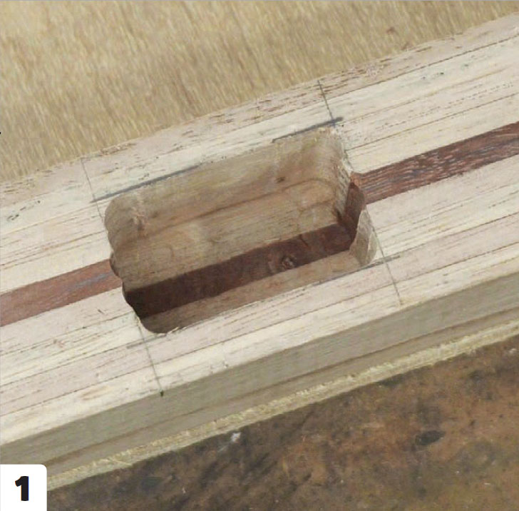 Bruk en overfres eller et stemjern til å fjerne 0,3 cm tre fra de 4,8 cm brede feltene. Sjekk fortløpende om fordypningene passer til rygg- og setestykkene. Alle de tre listene (E) skal ha likt mønster.