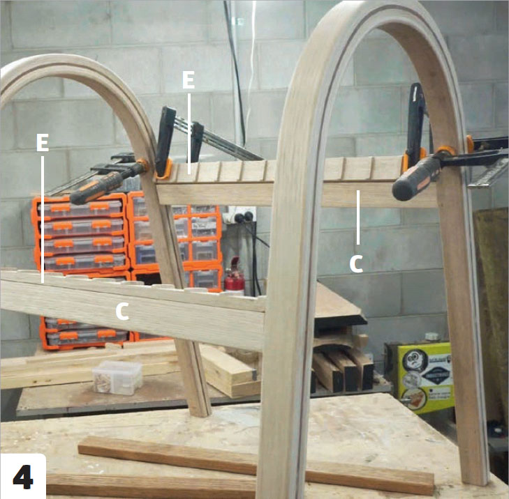 Før stolen kan settes sammen, skal det lages en rekke tverrgående elementer, som forbinder de to beinbuene og holder rygg- og setestykkene oppe og korrekt adskilt. To av de tverrgående listene (C) skal klargjøres til tappskjøter, og det skal lages hull til tappene i beinbuene.