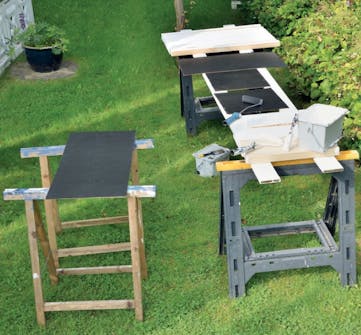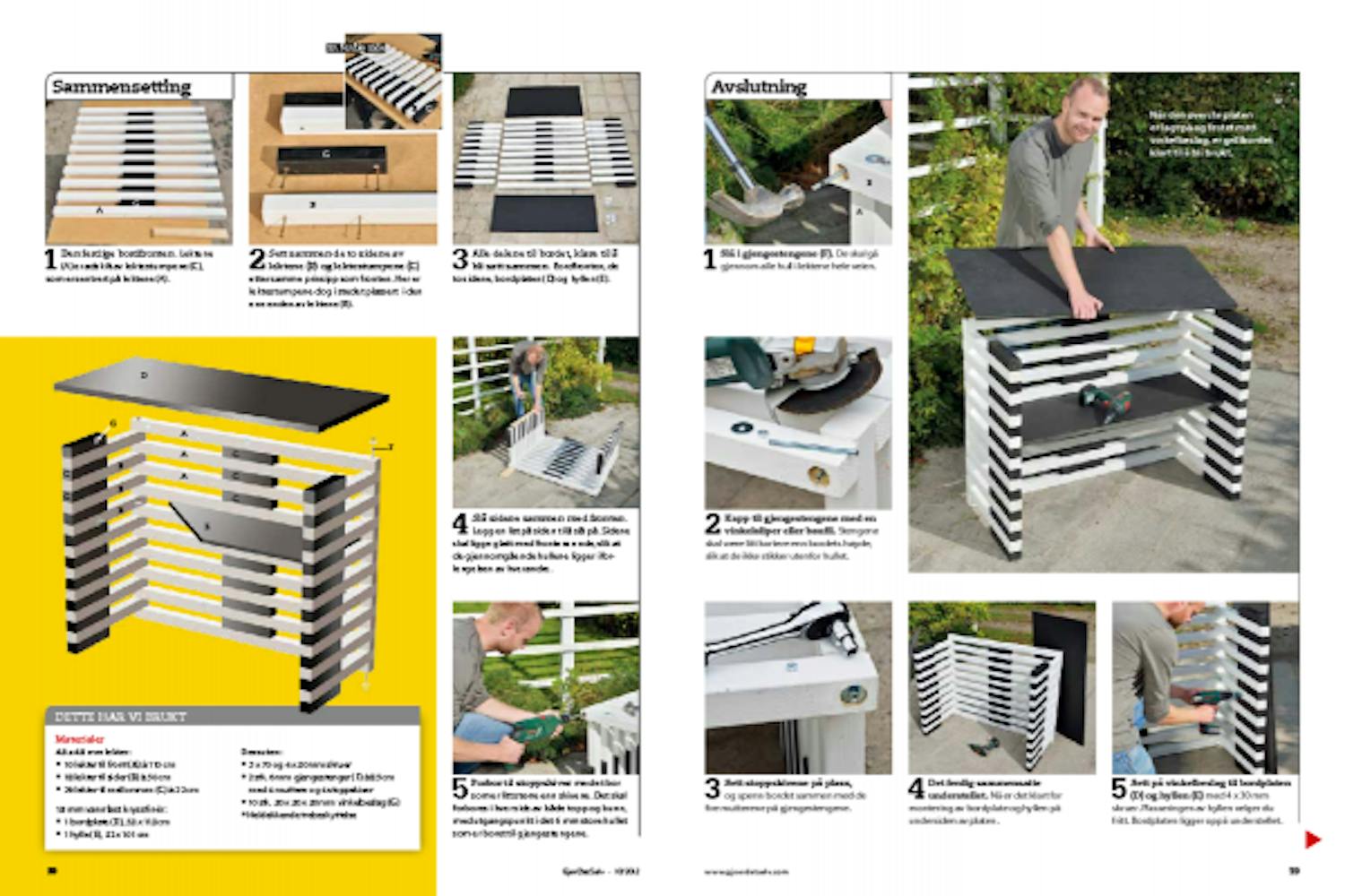 De lengste danner fronten på bordet, og de kortere er til de to sidene. De korteste lektene er “avstandsklosser” mellom de lange lektene, og skaper kontrasten. Vi lager en hylle og en bordplate av vannfast kryssfinér, som bare er festet med en rekke små vinkelbeslag. Til dette og de to øvrige prosjektene er det en fordel å ha en kappsag til seriekapping.