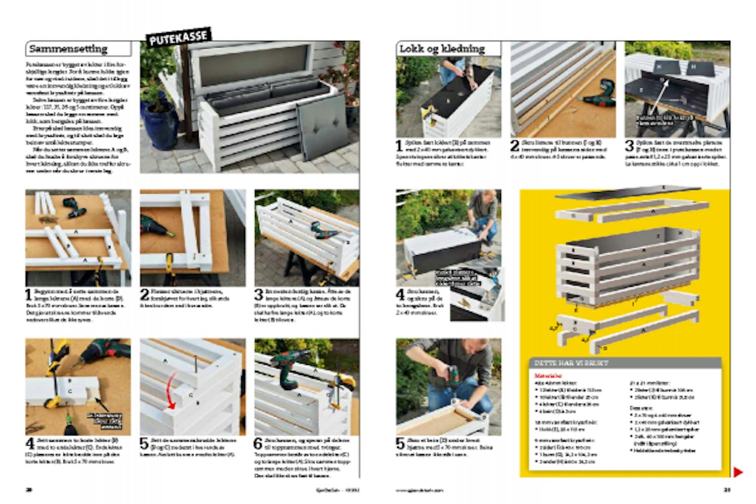 Putekassen er bygget av lekter i fire forskjellige lengder. For å kunne lukke igjen for vær og vind i sidene, skal det i tillegg være en innvendig kledning og et lokk av vannfast kryssfinér på kassen.