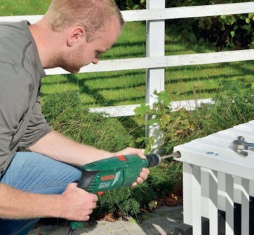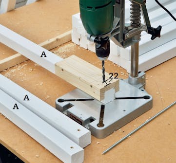 Bor hull til de to 6 mm gjengestengene (F) i begge ender av lektene (A), og i den ene enden av lektene (B) med et 8 mm bor. Hullene skal bores helt likt, 2,2 cm inn fra enden av lekten. Lag deg en mal av tre listebiter, som vist på bildet.