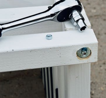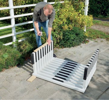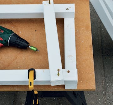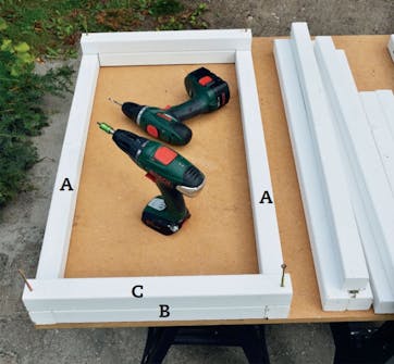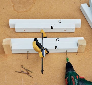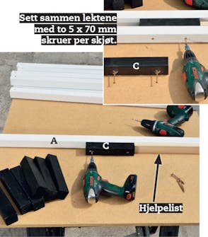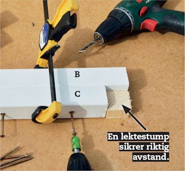 Sett sammen to korte lekter (B) med to endelekter (C). Endelekten (C) plasseres en lektebredde inne på den korte lekten (B). Bruk 5 x 70 mm skruer.