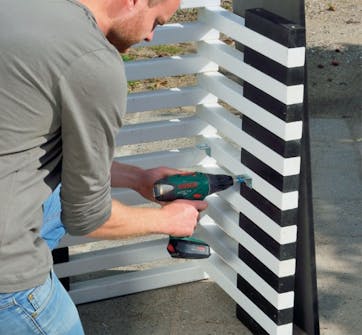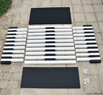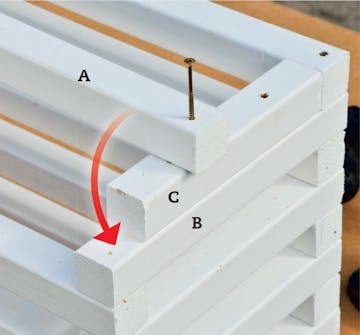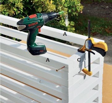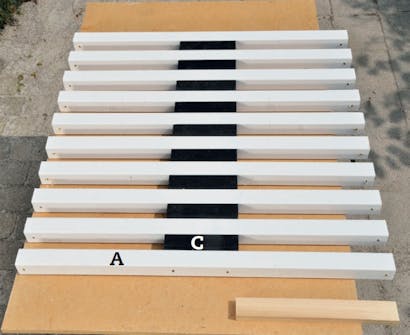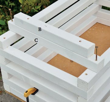 Sett sammen de fire lange ende-lektene (C) med de korte (B). De små lektene sikrer avstanden. Alle lektene settes sammen med 5 x 70 mm skruer.