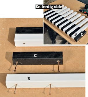 Den ferdige bordfronten. Lektene (A) er adskilt av lektestumpene (C), som er sentrert på lektene (A).