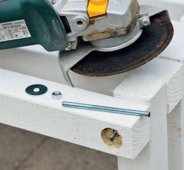 Kapp til gjengestengene med en vinkelsliper eller baufil. Stengene skal være litt kortere enn bordets høyde, slik at de ikke stikker utenfor hullet.