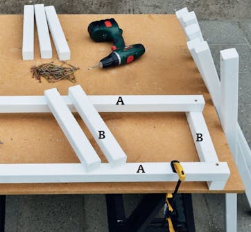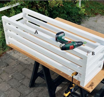 Begynn med å sette sammen de lange lektene (A) med de korte (B). Bruk 5 x 70 mm skruer. Senere snus kassen. Det gjør at skruene kommer til å vende nedover slik at de ikke synes.
