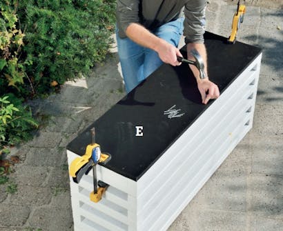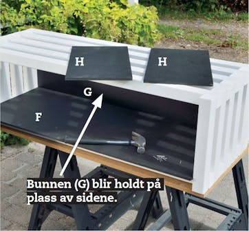 Spikre fast de svartmalte platene (F og H) inne i putekassen med et passe antall 1,2 x 25 mm galvaniserte spiker. La kantene stikke cirka 1 cm opp i lokket.