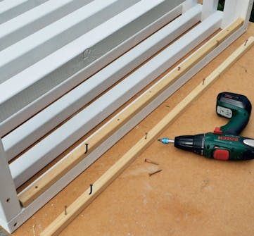Skru lektestumpene (C) mellom lektene (A). Lektestumpene sitter sentrert på lektene, så lag en hjelpelist som hjelper deg å holde avstanden mot siden.
