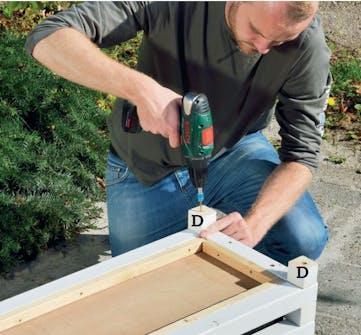 Skru de fire bunnlistene (G og H) inni som understøtting i bunnen med 4 x 50 mm skruer. Kassen kan brukes uten bunn, men da er det vanskelig å flytte blomsterkassen når den er fylt opp.
