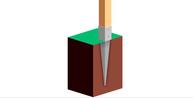 Stålspyd med en ramme til stolpen på toppen. Lett, rask og enkel løsning når stolpen skal holdes fast ved bakken – og verken skal motstå vridning eller trekk ovenfra.