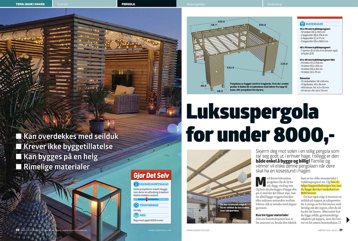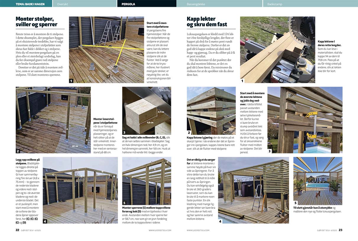 Luksuspergolaen er kledd med 124 lekter i fire forskjellige lengder, der flere er kappet på skrå for å møtes pent rundt de fremre stolpene. Derfor er det en god idé å kappe endene på skrå med kapp- og gjærsag. Da er du sikker på å få et pent resultat.