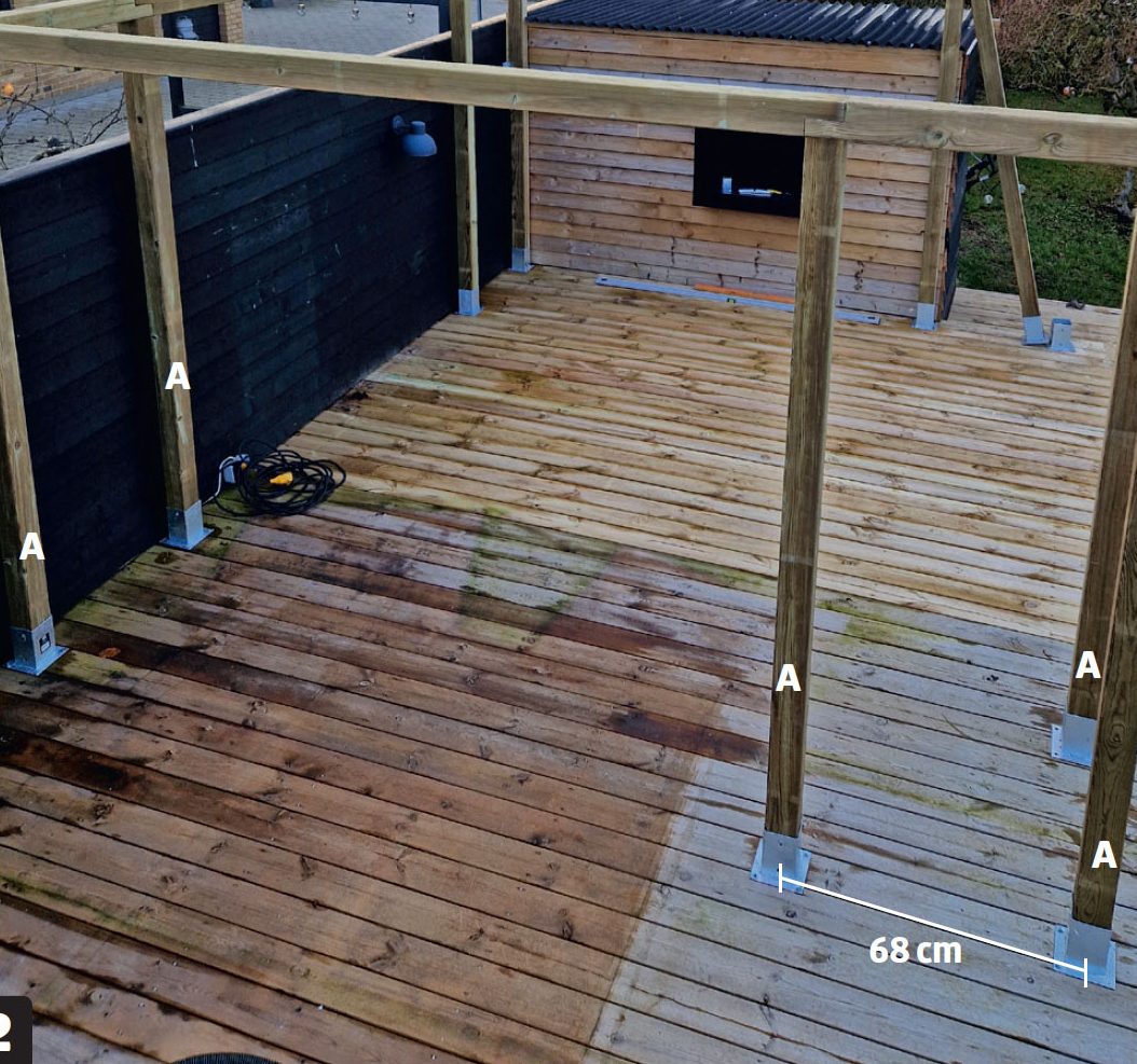 Første trinn er å montere de ti stolpene. I dette eksemplet, der pergolaen bygges på et eksisterende tredekke, har vi valgt å montere stolpene i stolpeføtter som skrus fast både i dekket og i stolpene. Hvis du vil montere pergolaen på en plen eller et steinbelagt underlag, kan du for eksempel grave ned stolpene eller bruke fundamentstein.