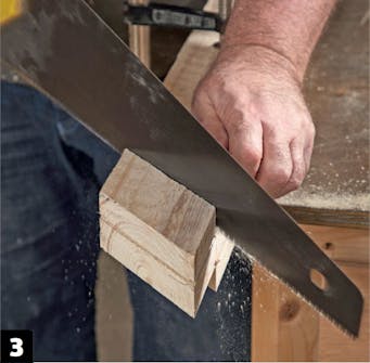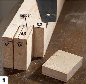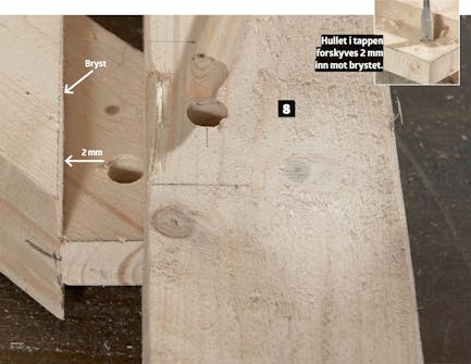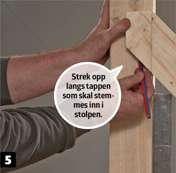 Sag tappen endelig til. Strek vinkelrett opp på brystet til tappen i flukt med yttersiden på skråstiveren, og sag vekk stykket.