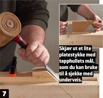 Legg tappen på tvers av overliggeren, og strek opp rundt den. Tapphullet blir, som tappen, 10 cm i den ene retningen.