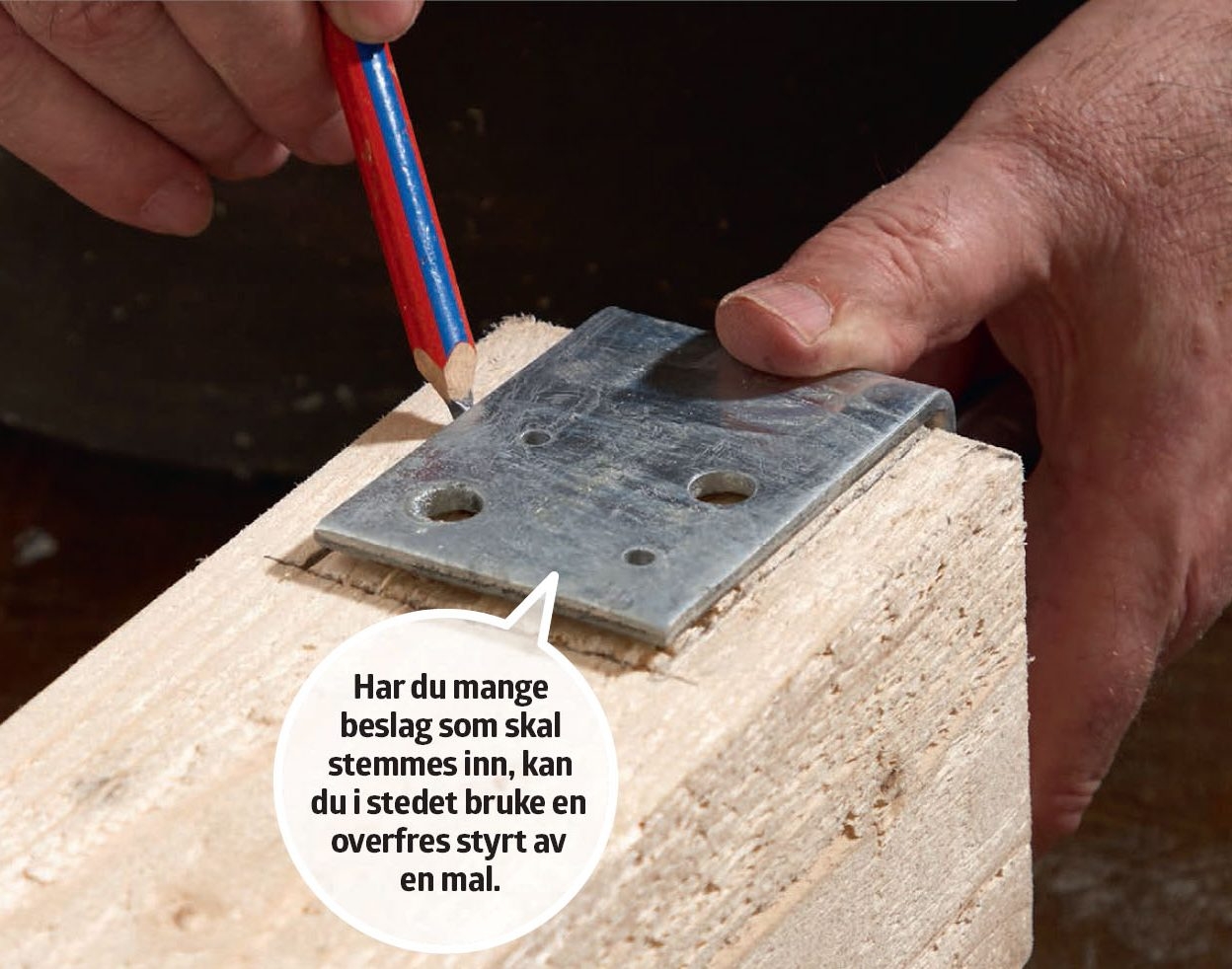 Strek opp beslaget på stolpe siden. Stikk deretter loddrett ned i streken hele veien rundt med et skarpt stemjern.
