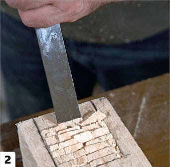 Stem ut det skrå feltet. Begynn med øyemål, og stem deg inn mot den loddrette delen av hullet. Lag en liten 45° kloss, som vist, og la den styre stemjernets vinkel.