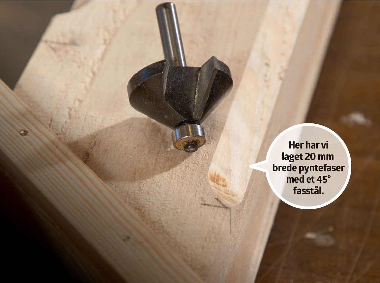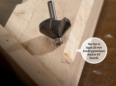 Sett et 45° fasstål i overfresen. Senk stålet ned, til det treffer stolpekanten. Etterpå er det bare å føre overfresen langs kanten på det stykket du vil avfase.