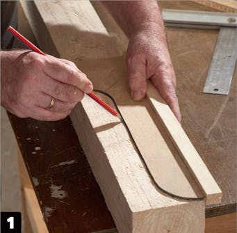 Strek opp etter en mal. Malen kan for eksempel lages av en tynn treplate eller en pappskive, og utstyres med en list som vist. Da kan den legges vinkelrett på stolpen.
