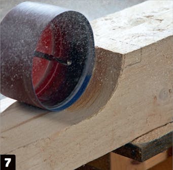Skru fast et hjelpebord til siden på stolpen. Bordet hjelper til med å understøtte hullsagen, som skal sage en runding i stolpen for å lage profilen.
