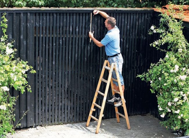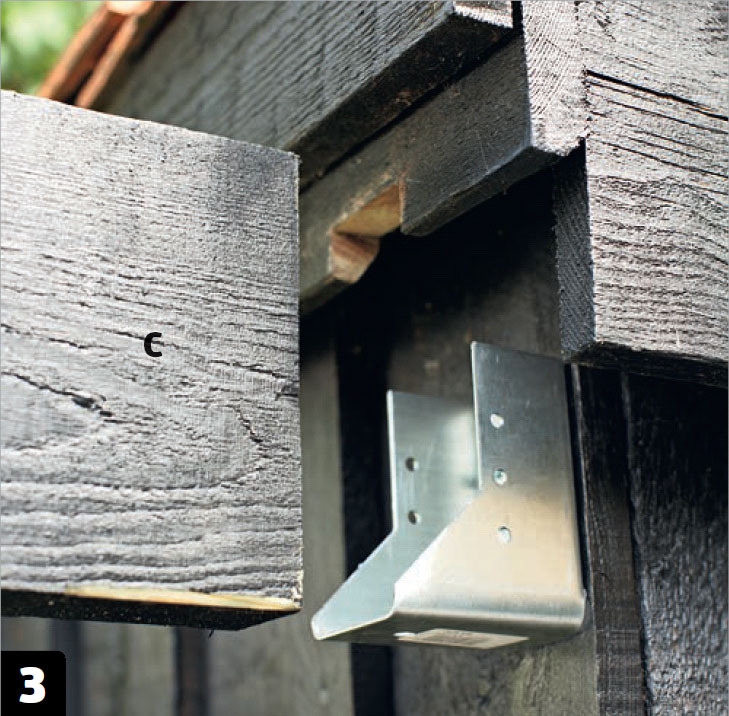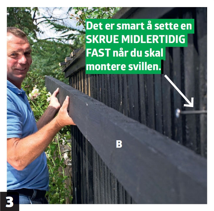 Her er det lister på gjerdet som skal fjernes. Det er viktig, slik at svillen (B) kan sitte på en helt plan flate. Når listene kappes rett over, vil de understøtte svillen. Bruk en håndsag eller en multikutter til jobben.