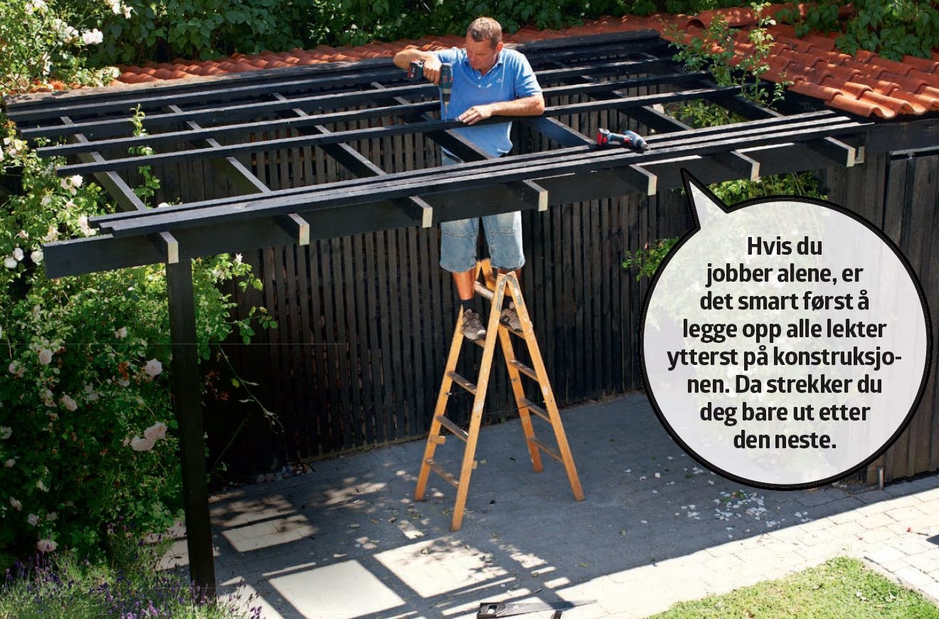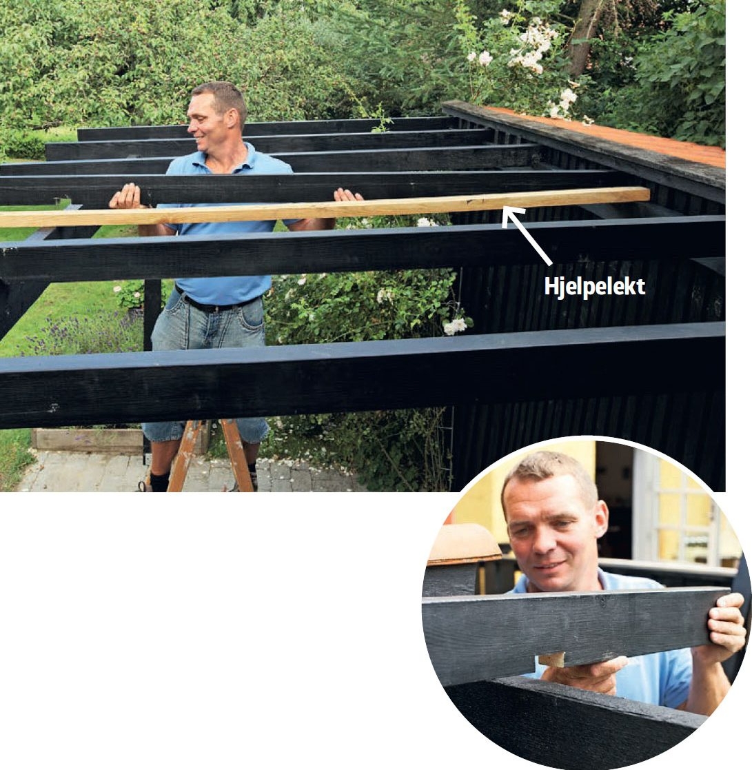 Oppå sperrene skal det monteres tverr gående lekter. Da får pergolaens tak et slags flettemønster, som vil understøtte planter som skal vokse over “taket”.