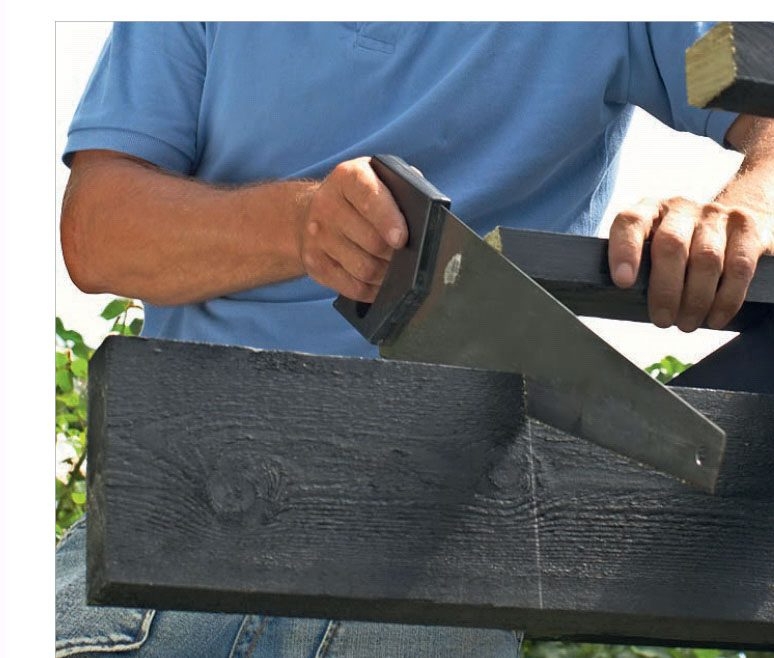 For å få en solid konstruksjon, skal det lages to hakk i hver sperre - et i hver ende - slik at sperrene får godt tak i svillene. I den enden som skal settes fast til den bakerste svillen, sages hjørnet av sperren (2 cm dypt og 5 cm langt). Da vil sperren flukte med overkanten på den øverste listen til gjerdet.