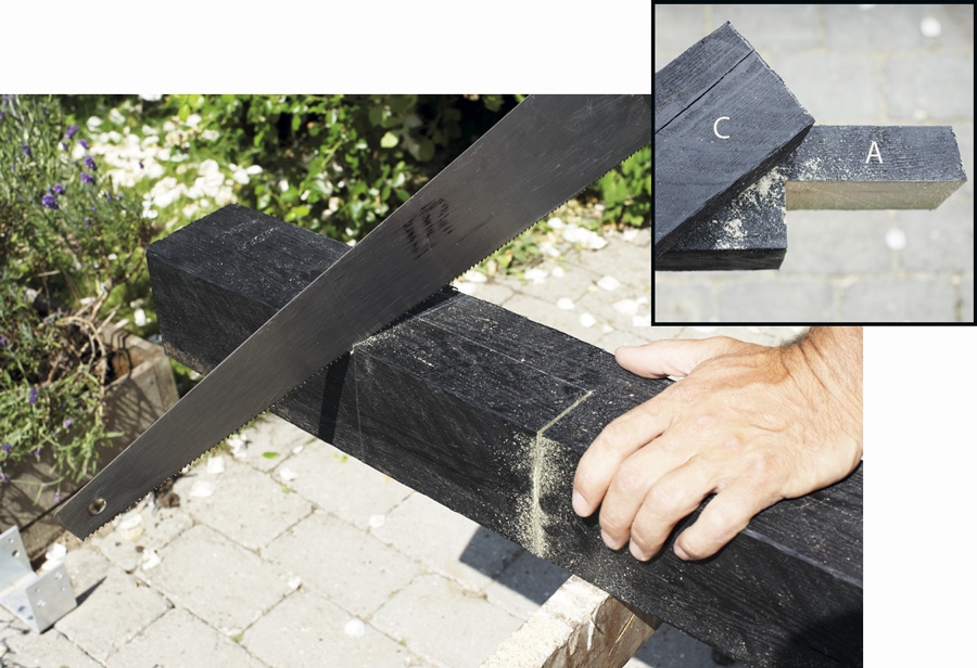 Sag et hakk i stolpen (A) til svillen (C). Hakket skal ha en dybde som tilsvarer halvparten av stolpens bredde.