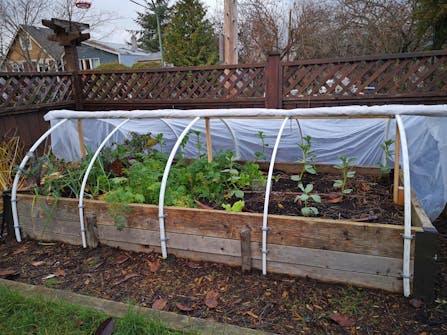 Det er enkelt å dekke plantekassen hvis du lager et stativ, for eksempel av plastrør, som bøyes i buer som plasten kan rulles over. Husk også å lukke endene, slik at plasttaket blir helt tett.