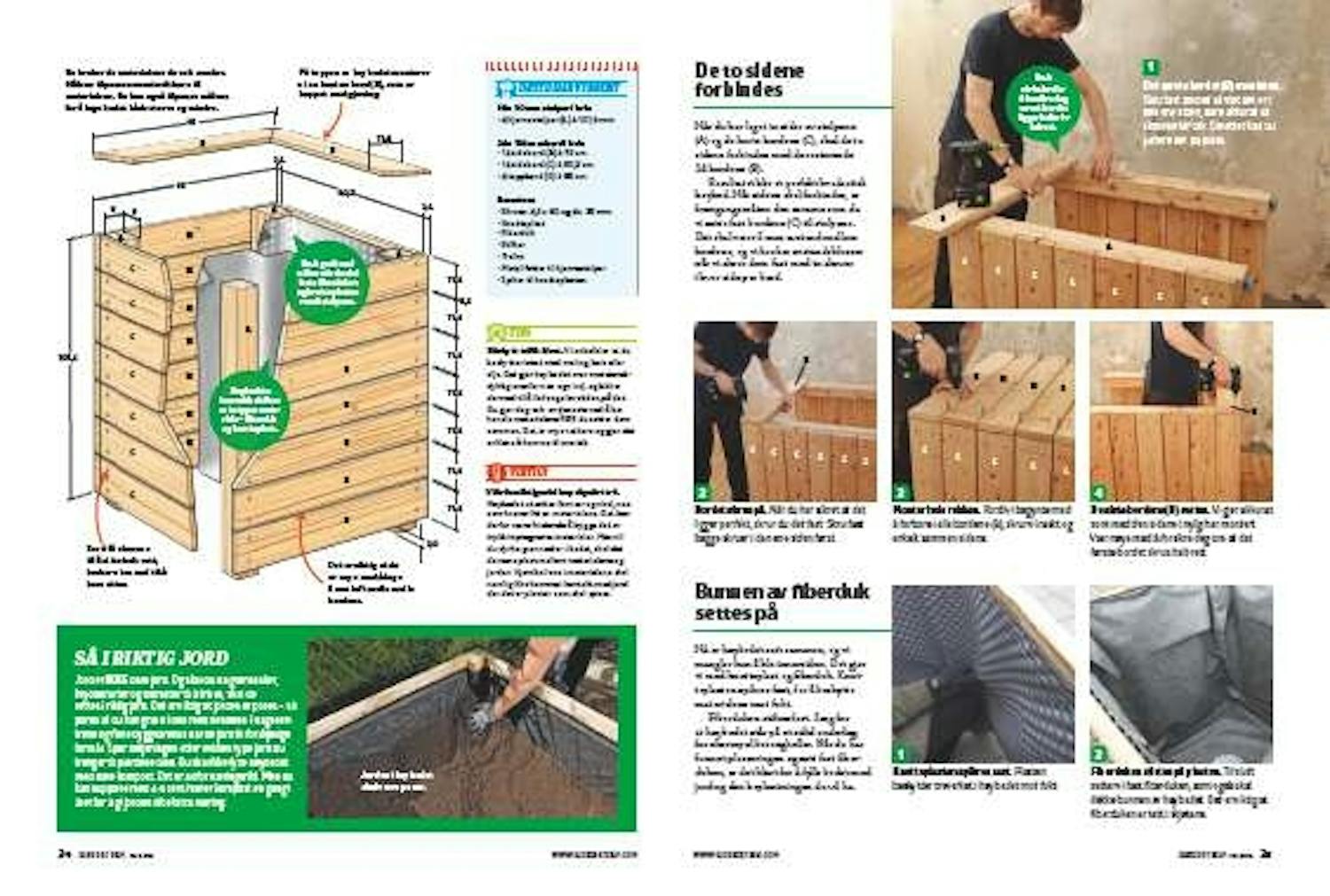 Resultatet blir en perfekt kvadratisk plantekasse. Når sidene skal forbindes, er fremgangsmåten den samme som da vi satte fast bordene (C) til stolpene. Det skal være 5 mm avstand mellom bordene, og vi bruker avstandsklosser når vi skrur dem fast med to skruer i hver side per bord.