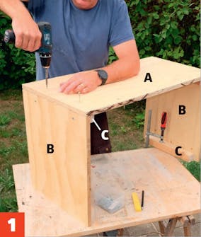 Sett sammen sidene (A) og endene (B) ved å skru dem fast på hjørnene (C) med skruer på 4,5 x 60 mm. Hjørnene skal stoppe 5 cm under rammekanten.