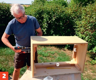 Sett forsterkninger (D) og bærestykker (E) på rammens innside med skruer på 4,5 x 60 mm. Se den nøyaktige plasseringen på tegningen.