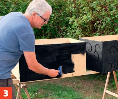 Mal rammen med en passende trebeskyttelse til utendørsbruk. Her er det brukt en svart terrasseolje. Før du maler kan du velge å avrunde de utvendige hjørnene med en overfres.
