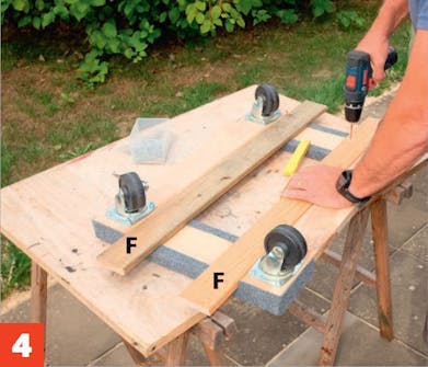 Sett bærestykker (F) på undersiden av transport platen med skruer på 4,5 x 40 mm. Bærestykkene holder rammen et stykke over underlaget.