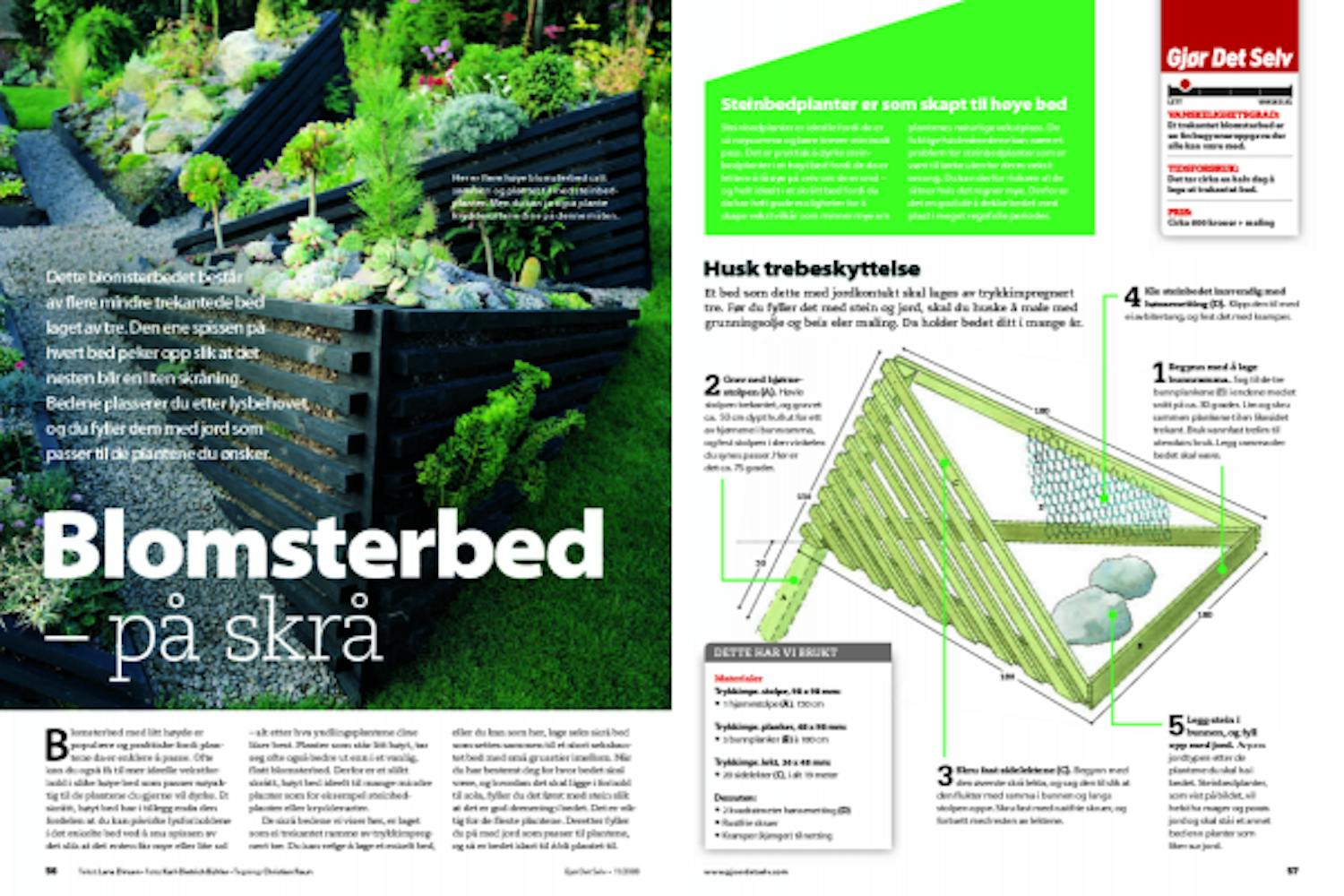 1. Begynn med å lage bunnramma. Sag til de tre bunnplankene (B) i endene med et snitt på ca. 30 grader. Lim og skru sammen plankene til en likesidet trekant. Bruk vannfast trelim til utendørs bruk. Legg ramma der bedet skal være.
