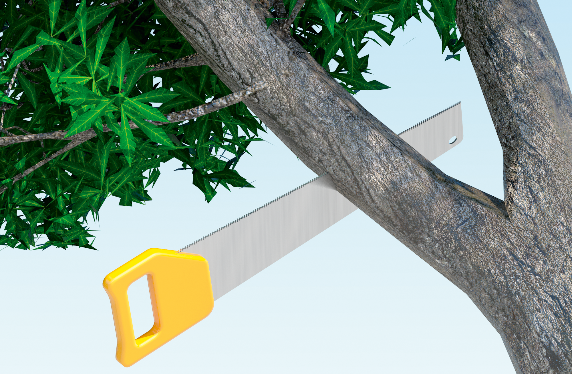 Du skal begynne med å legge et snitt på undersiden, gjerne omkring en tredjedel gjennom greintykkelsen. Når du deretter sager fra oversiden, brekker greinen uten risiko for at barken trekkes i stykker. Sag av greinstumpen tett mot stammen til slutt.