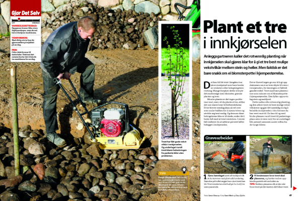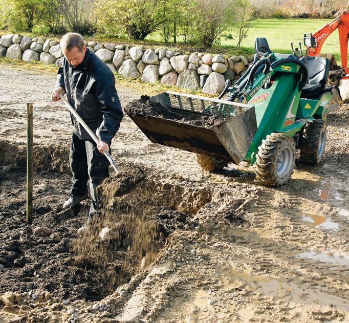 Vi må flytte noen kubikkmeter jord og stein før vi kan plante treet i innkjørselen, og derfor leier vi maskiner. Det er både raskere og lettere enn å bruke spade og skuffe - dersom du er så heldig at du har et utleiebyrå i nærheten.